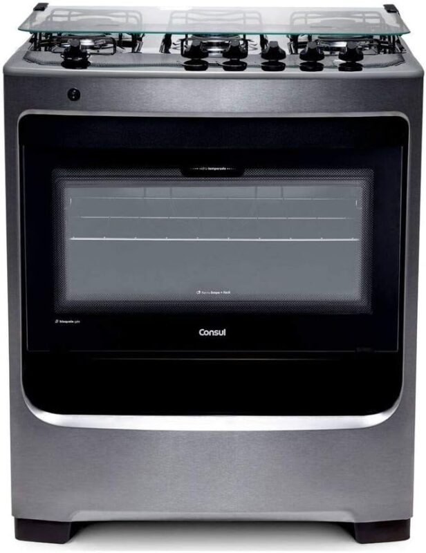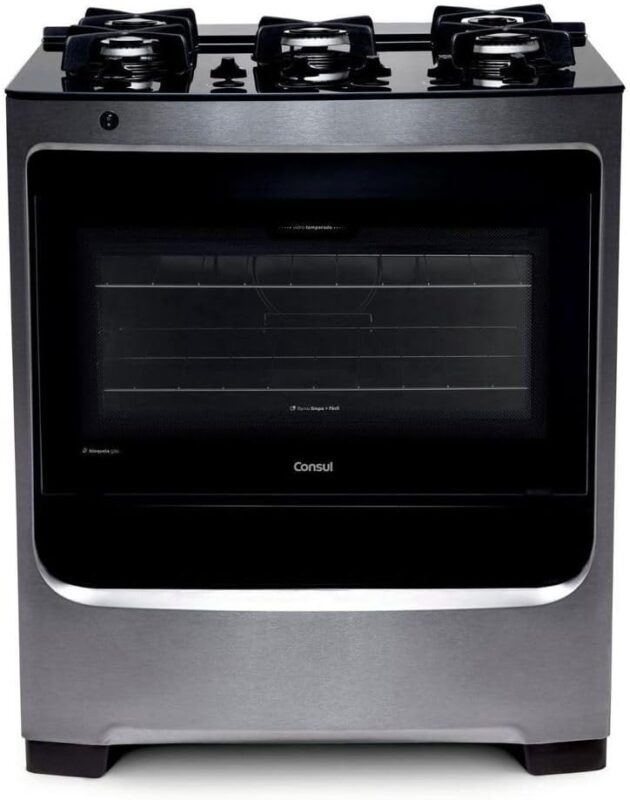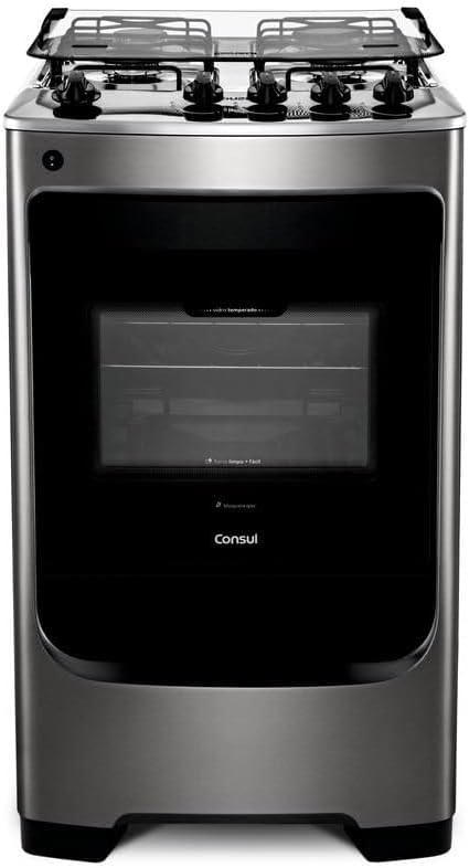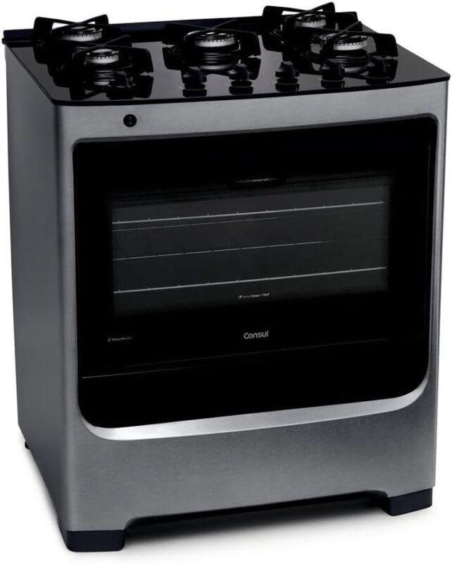 Fogão Consul 5 bocas cor Inox com mesa de vidro e grade de ferro fundido – CFS5VAR BIVOLT
